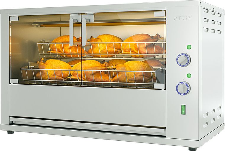 Модель оснащена 4 легкосъемными садками (люльками), вращающимися вокруг центральной оси внутри рабочей камеры. Корпус выполнен из пищевой нержавеющей стали AISI 430, садки для кур - из нержавеющего прутка, двери - из закаленного термостойкого ударопрочного стекла.