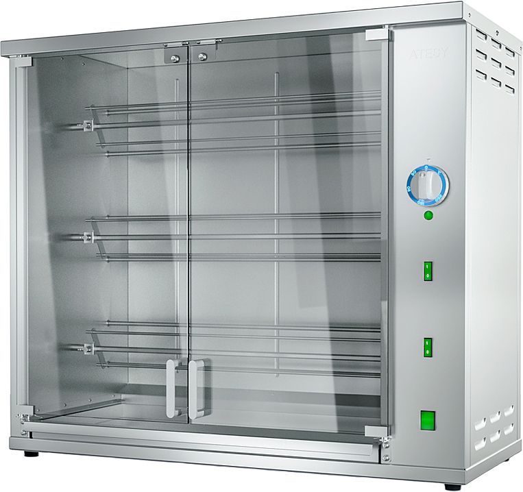 Модель оснащена 3 съемными шампурами, каждый из которых рассчитан на 5 кур. Корпус и все внутренние элементы, контактирующие с продуктами, выполнены из пищевой нержавеющей стали AISI 430, двери - из закаленного термостойкого стекла.