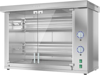 Модель оснащена 2 съемными шампурами, каждый из которых рассчитан на 5 кур. Корпус и все внутренние элементы, контактирующие с продуктами, выполнены из пищевой нержавеющей стали AISI 430, двери - из закаленного термостойкого стекла.