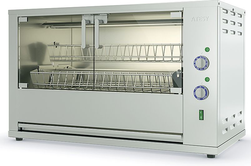 Модель оснащена 4 легкосъемными садками (люльками), вращающимися вокруг центральной оси внутри рабочей камеры. Корпус выполнен из пищевой нержавеющей стали AISI 430, садки для кур - из нержавеющего прутка, двери - из закаленного термостойкого ударопрочного стекла.