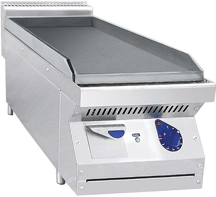 Модель оснащена контрольными лампами, терморегулятором, желобом для стекающей жидкости и бортиком от разбрызгивания.