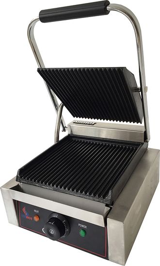Гриль предназначен для обжаривания стейков и сосисок, приготовления сэндвичей, полуфабрикатов, подогрева булочек, гамбургеров, хот-догов на предприятиях общественного питания и торговли. Модель оснащена регулируемым термостатом, индикатором нагрева и лотком для сбора жира. Корпус выполнен из нержавеющей стали.