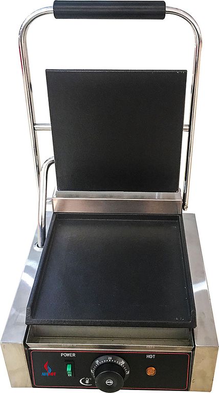 Гриль предназначен для обжаривания стейков и сосисок, приготовления сэндвичей, полуфабрикатов, подогрева булочек, гамбургеров, хот-догов на предприятиях общественного питания и торговли. Модель оснащена регулируемым термостатом, индикатором нагрева и лотком для сбора жира. Корпус выполнен из нержавеющей стали.