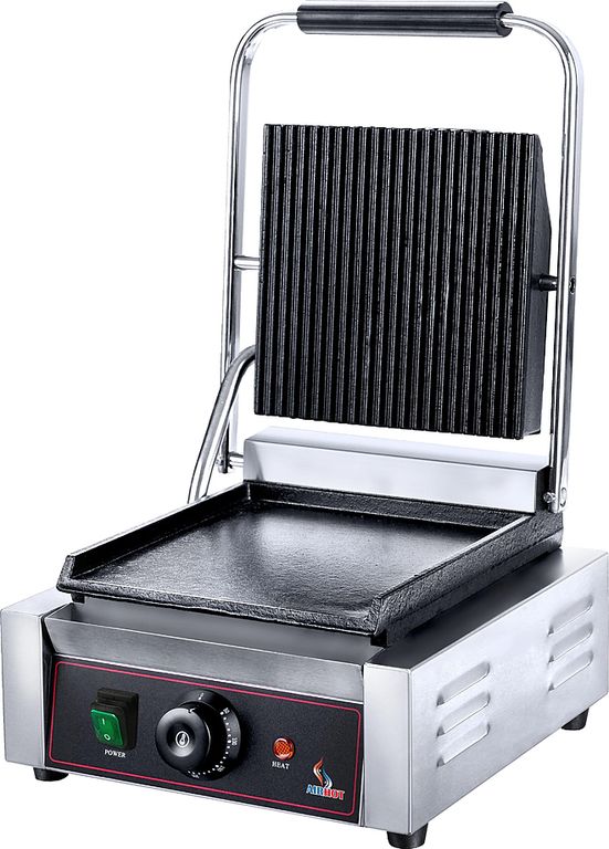 Гриль предназначен для обжаривания стейков и сосисок, приготовления сэндвичей, полуфабрикатов, подогрева булочек, гамбургеров, хот-догов на предприятиях общественного питания и торговли. Модель оснащена регулируемым термостатом, индикатором нагрева и лотком для сбора жира. Корпус выполнен из нержавеющей стали, жарочная поверхность - из чугуна с антипригарным покрытием.