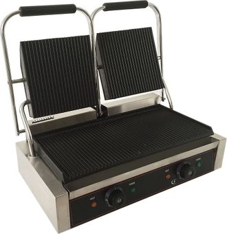 Гриль предназначен для обжаривания стейков и сосисок, приготовления сэндвичей, полуфабрикатов, подогрева булочек, гамбургеров, хот-догов на предприятиях общественного питания и торговли. Модель оснащена регулируемым термостатом, индикатором нагрева и лотком для сбора жира. Корпус выполнен из нержавеющей стали, жарочная поверхность - из чугуна с антипригарным покрытием.