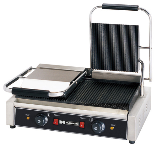 Гриль предназначен для обжаривания стейков и сосисок, приготовления сэндвичей, полуфабрикатов, подогрева булочек, гамбургеров, хот-догов на предприятиях общественного питания и торговли. Модель оснащена регулируемым термостатом, индикатором нагрева и лотком для сбора жира. Корпус выполнен из нержавеющей стали, жарочная поверхность - из чугуна с антипригарным покрытием.