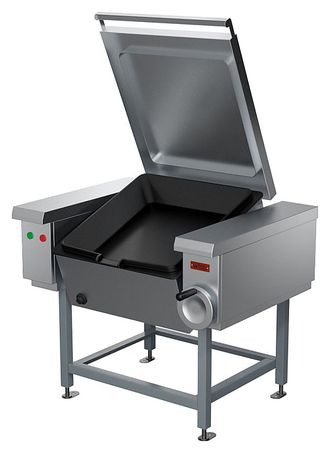Опрокидывающаяся сковорода используется на предприятиях общественного питания и торговли для жарения основным способом и во фритюре, для тушения, припускания, пассерования, а также для приготовления на пару мясных, рыбных, овощных блюд и кулинарных изделий. Сварной каркас выполнен из черного металла с порошковым покрытием, облицовки - из углеродистой стали с покрытием, чаша - из чугуна, передняя облицовка и крышка - из нержавеющей стали.