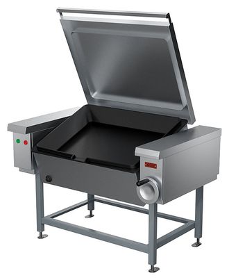Опрокидывающаяся сковорода используется на предприятиях общественного питания и торговли для жарения основным способом и во фритюре, для тушения, припускания, пассерования, а также для приготовления на пару мясных, рыбных, овощных блюд и кулинарных изделий. Сварной каркас выполнен из черного металла с порошковым покрытием, чаша - из чугуна, облицовки и крышка - из нержавеющей стали.