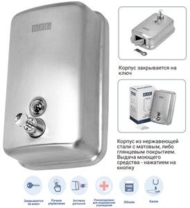 BXG-SD-H1-1000 M - стильный и надежный механический диспенсер для мыла с корпусом из нержавеющей стали. Идеально подходит для использования в местах с высокой проходимостью. Благодаря корпусу, выполненному из нержавеющей стали, устойчив к механическим повреждениям.