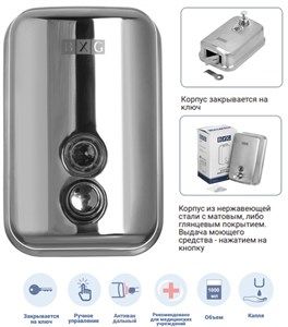BXG-SD-H1-1000 - стильный и надежный механический диспенсер для мыла с корпусом из нержавеющей стали. Идеально подходит для использования в местах с высокой проходимостью. Благодаря корпусу, выполненному из нержавеющей стали, устойчив к механическим повреждениям.