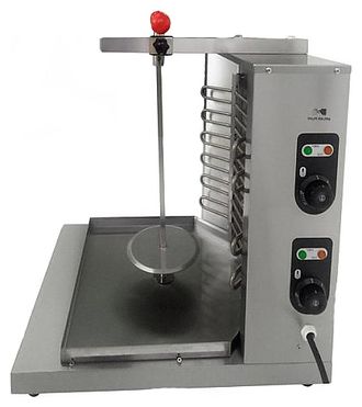 Гриль для шаурмы без электропривода - используется на предприятиях общественного питания и торговли для запекания специально подготовленного свиного, говяжьего, бараньего и куриного мяса. Модель оснащена 2 зонами нагрева и регулируемым расстоянием между ТЭНами и мясом. Корпус выполнен из нержавеющей стали.