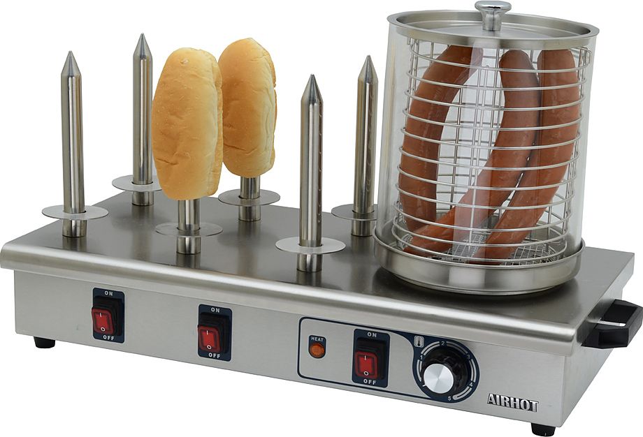 Аппарат для хот-догов используется на предприятиях общественного питания и торговли для отваривания и хранения в горячем виде сосисок и подогрева булочек. Модель оснащена регулятором температуры, раздельным нагревом колбы и штырей, паровой баней и 6 нагреваемыми штырями. Корпус выполнен из нержавеющей стали и крашенного металла, штыри - из нержавеющей стали, колба - из стекла