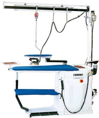 Модель оснащена встроенным парогенератором, поворотной рукавной формой с вакуумом и наддувом и нагревом, блоком подсветки с подвеской утюга и поворотной подставкой для утюга.