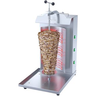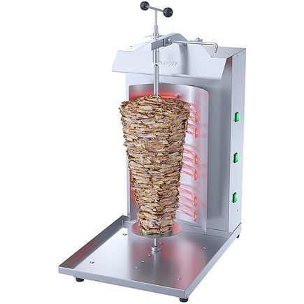 Аппарат для шаурмы Atesy Шаурма 3-Эл-05-Оц предназначен для приготовления шаурмы на предприятиях общественного питания. Он используется для жарки мяса, которое предварительно прошло процесс маринации. Равномерное приготовление продукта достигается за счет особой формы ТЭНов и оптимальной скорости вращения ножа, а также наличия отражателей тепла. Принцип работы устройства заключается в том, что мясная нарезка, сформированная в цилиндр, насаживается на специальный нож и вращается при помощи ручного воротка около электронагревателей (ТЭНов) до готовности.