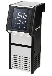Модель оснащена сенсорным дисплеем с индикацией рабочей температуры, зажимом для закрепления на емкости и циркуляционной помпой, которая обеспечивает заданную температуру по всему объему. Корпус выполнен из анодированного алюминия.