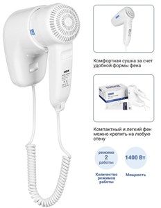 BXG-1200 H1 - компактный и надежный фен для волос, предназначенный для использования в гостиницах, жилых помещениях и проч. Фен подает только горячий воздух и обладаете двумя скоростями подачи.