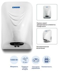 BXG-100 - компактная, мощная и надежная сушилка для рук. Сушилка оснащена сенсорным датчиком, что обеспечивает автоматическое включение и отключение аппарата. Сушилка оснащена функцией автоматического отключения для экономии электроэнергии. В случае постоянного нахождения посторонних предметов в зоне срабатывания датчика устройство отключается через 60 секунд. Так же прибор оснащён функцией защиты от перегрева - температура срабатывания защитного отключения 105 °С.