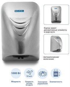BXG-100 С - компактная, мощная и надежная сушилка для рук. Сушилка оснащена сенсорным датчиком, что обеспечивает автоматическое включение и отключение аппарата. Сушилка оснащена функцией автоматического отключения для экономии электроэнергии. В случае постоянного нахождения посторонних предметов в зоне срабатывания датчика устройство отключается через 60 секунд. Так же прибор оснащён функцией защиты от перегрева - температура срабатывания защитного отключения 105 °С.