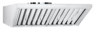Устройство работает по принципу принудительной вытяжки с фильтрацией. Встроенный осевой вентилятор засасывает разогретый, насыщенный парами воздух. Проходя через лабиринтные фильтры, пары воды, масла и жира конденсируются на их стенках из-за перепада температур. Конденсат стекает в герметичную ванну, а очищенный воздух удаляется из помещения через систему вентиляции. Зонт обеспечивает производительность 1400 м³/ч, что гарантирует эффективную очистку воздуха в рабочей зоне.